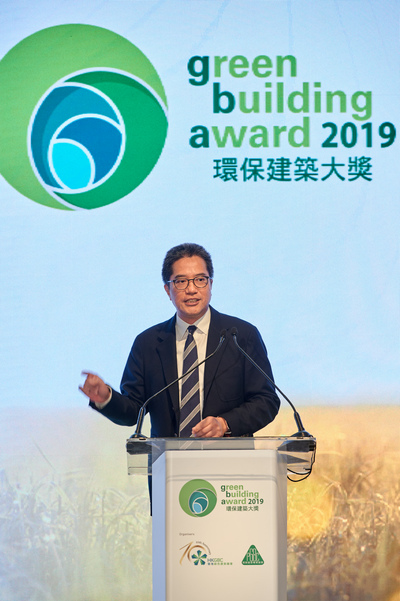(6 November 2019, Hong Kong) Winners of the Green Building Award 2019 (GBA 2019) were announced at an award presentation ceremony hosted at JW Marriott Hotel Hong Kong on Tuesday, 5 November 2019. Over 400 distinguished guests, including developers, construction companies, consultants, property management companies, representatives from professional institutions, as well as the representatives of government attended the event. The Guest of Honour, Mr Michael Wong Wai-lun, JP, Secretary for Development, Government of the HKSAR cum Honorary Advisor of GBA 2019 Jury Panel, together with Special VIP Guest Mr Wong Kam-sing, GBS, JP, Secretary for the Environment, Government of the HKSAR, commended the contribution made by leading stakeholders in the building industry.