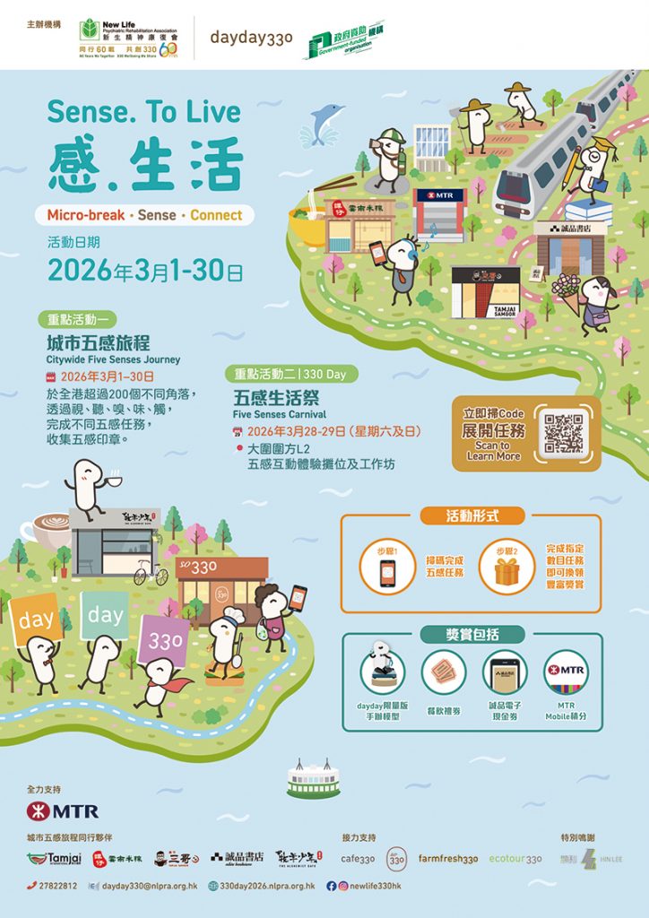 (Hong Kong, 26 February 2026) New Life Psychiatric Rehabilitation Association’s (NLPRA) public mental health campaign dayday330 has partnered with MTR Corporation (“MTR”), Tam Jai International’s brands TamJai Yunnan Mixian and TamJai SamGor Mixian (“Tam Jai International”), eslite bookstore (“eslite”), The Alchemist Cafe, and the social enterprise partners under New Life, including cafe330, so330 and New Life Farm, to launch 330 Day 2026.